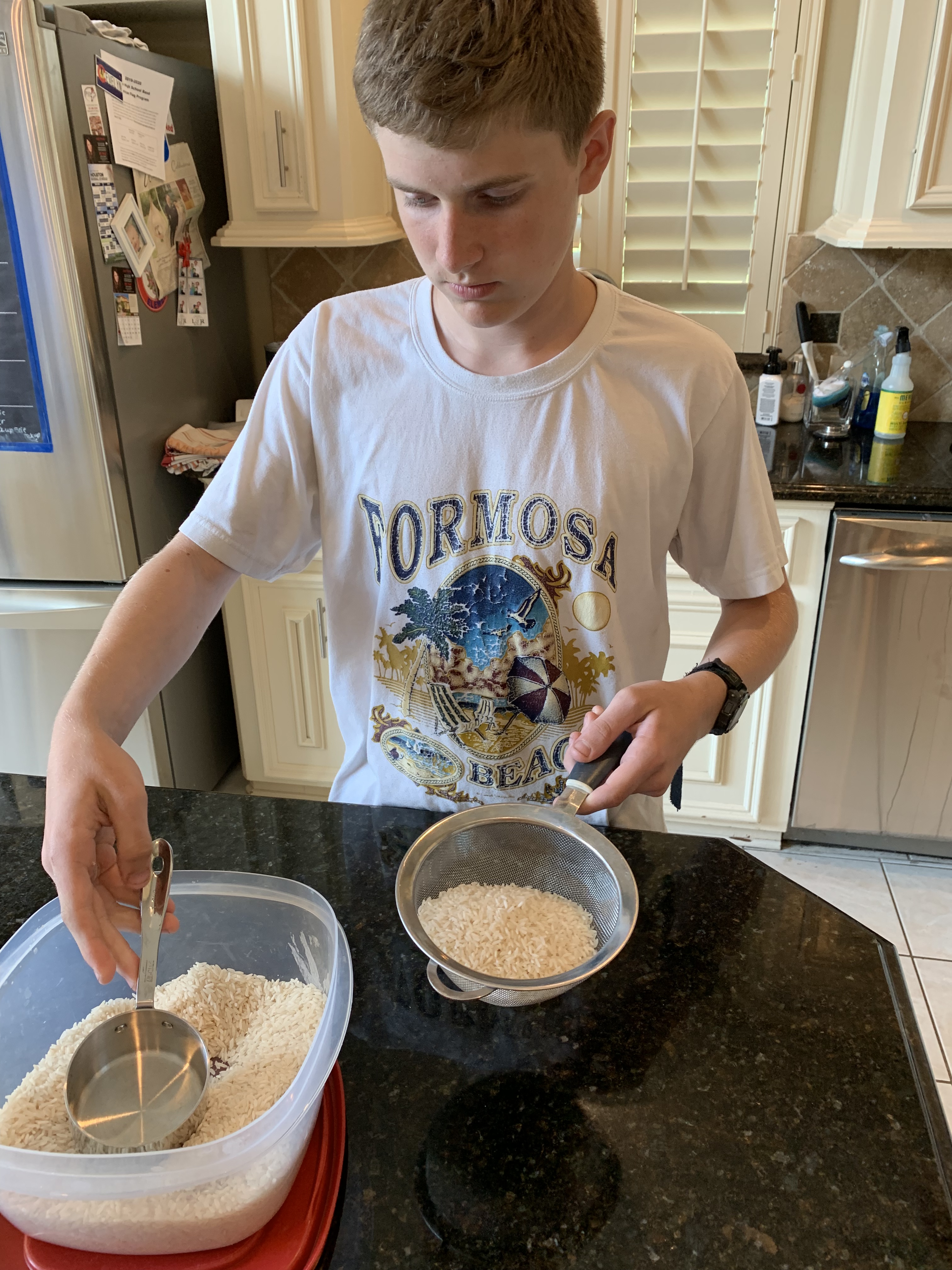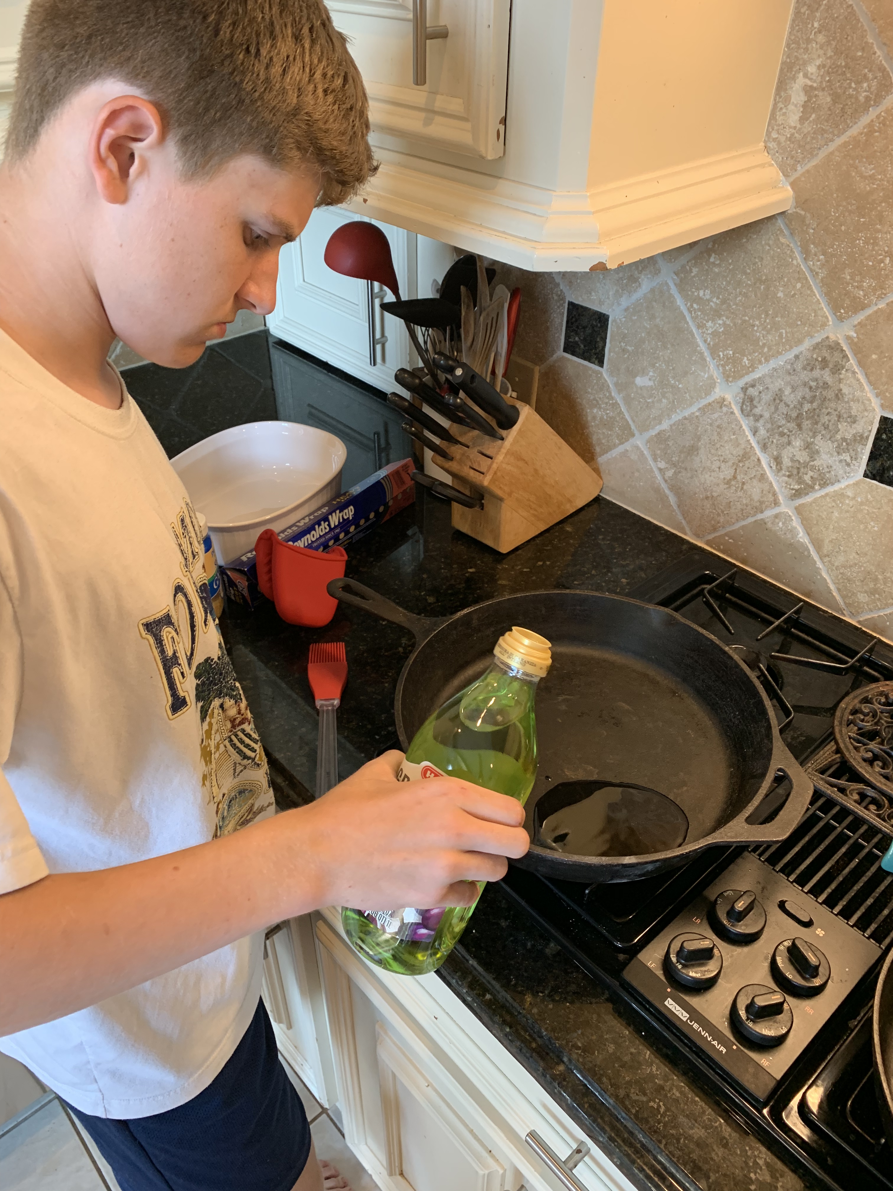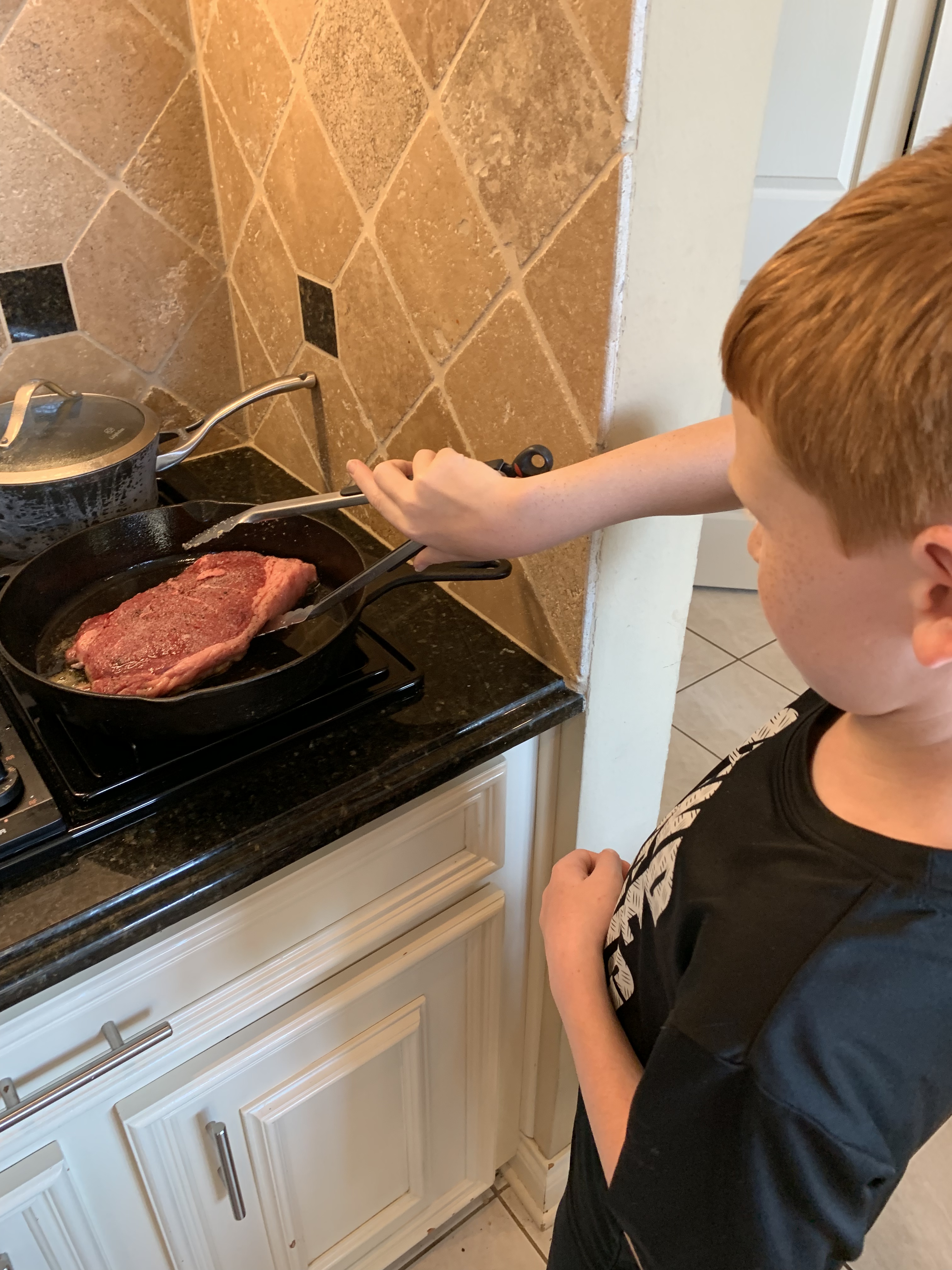 Our first lesson was foiled by a very important date for all the kids at the movie theater. Stay tuned because we are going to learn how to pan fry sirloin steaks on a cast iron skillet and make rice. George is the leader for this meal because he fell in love with “6-inch sirloin steaks” on multiple Carnival cruises. It’s definitely his favorite meal!