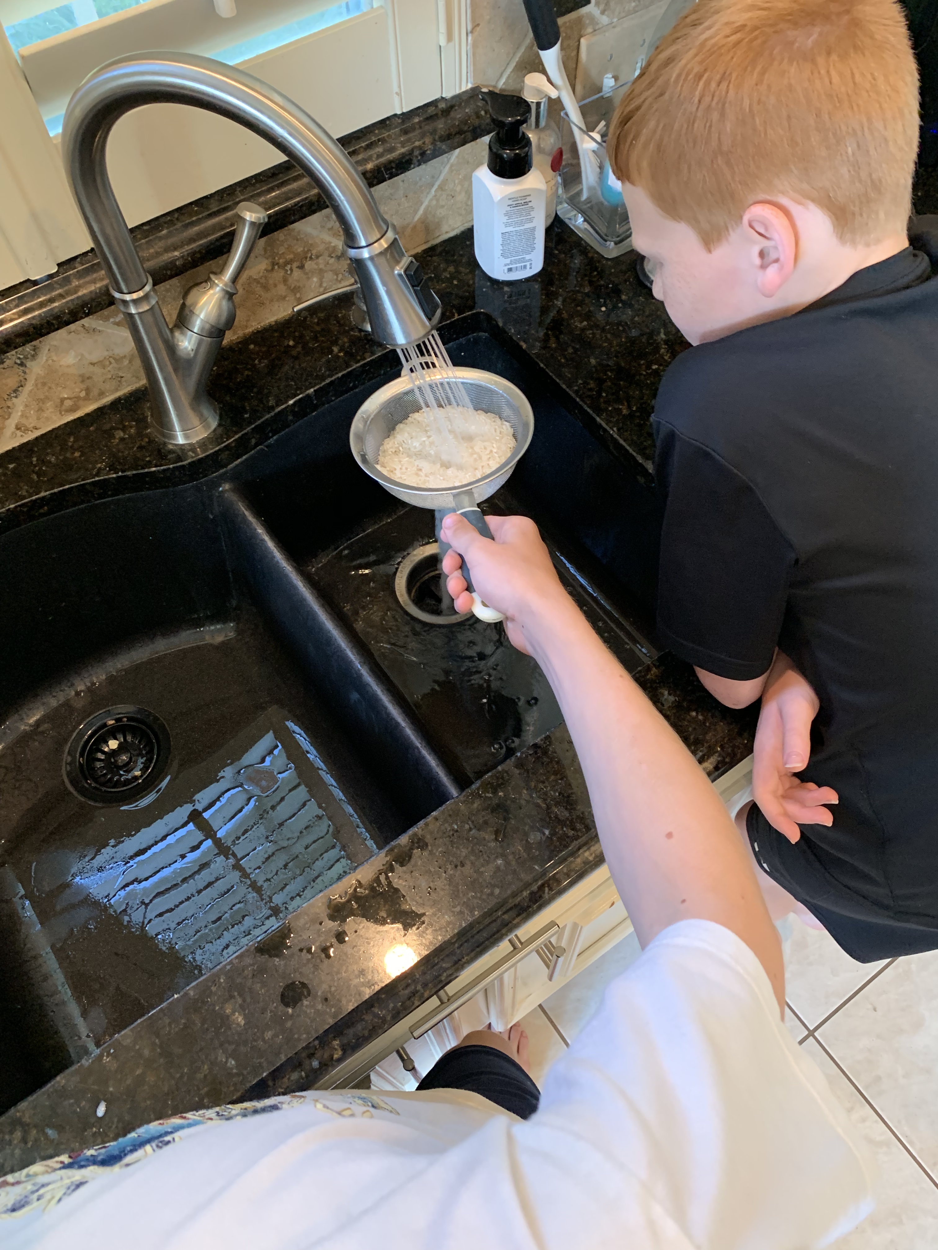 1. Place rice in strainer and rinse until water runs clear. If you don’t have a strainer, you can pour the rice into a bowl of water and mix it about with your CLEAN hands. Pour out the cloudy water and repeat the process until the water is no longer cloudy. My kids were super annoyed by this “time consuming” process, which isn’t really all that time consuming. So, what’s the purpose of this? You are rinsing the excess starch off of the grains of rice so that when you cook them they don’t stick together and clump. You’ll notice that our rice was still a little clumpy, so we should have rinsed a bit longer.