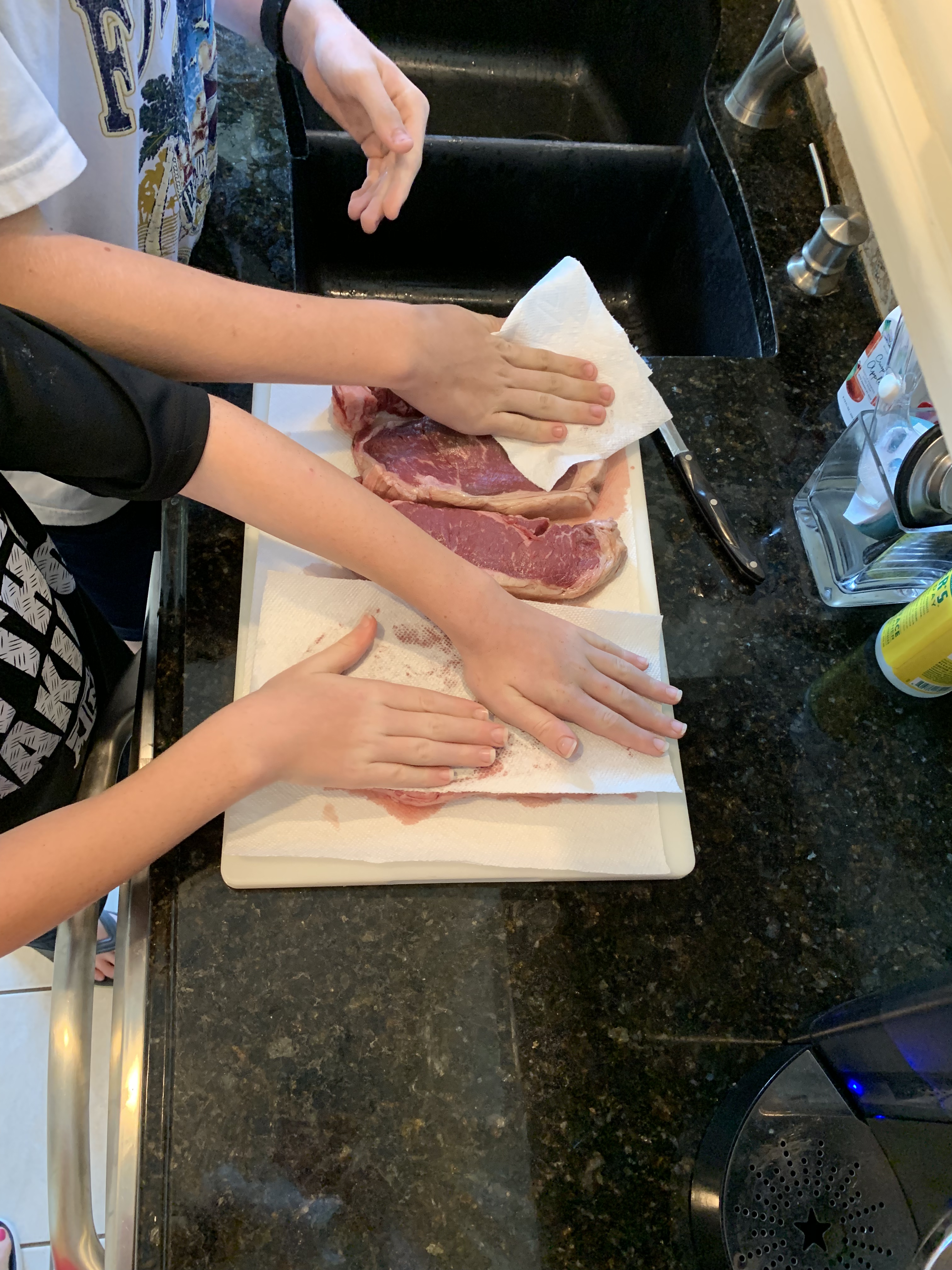 3. Once the steaks reach room temperature and you’re ready to start cooking them, pat them dry using a CLEAN paper towel(s).