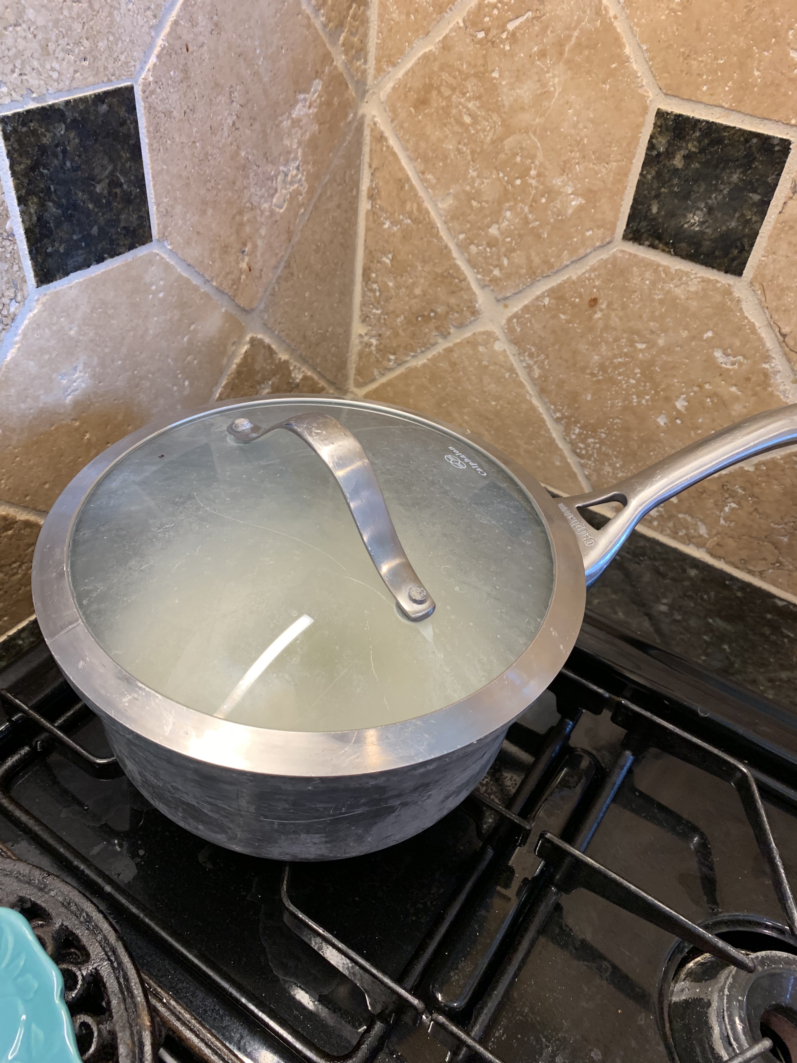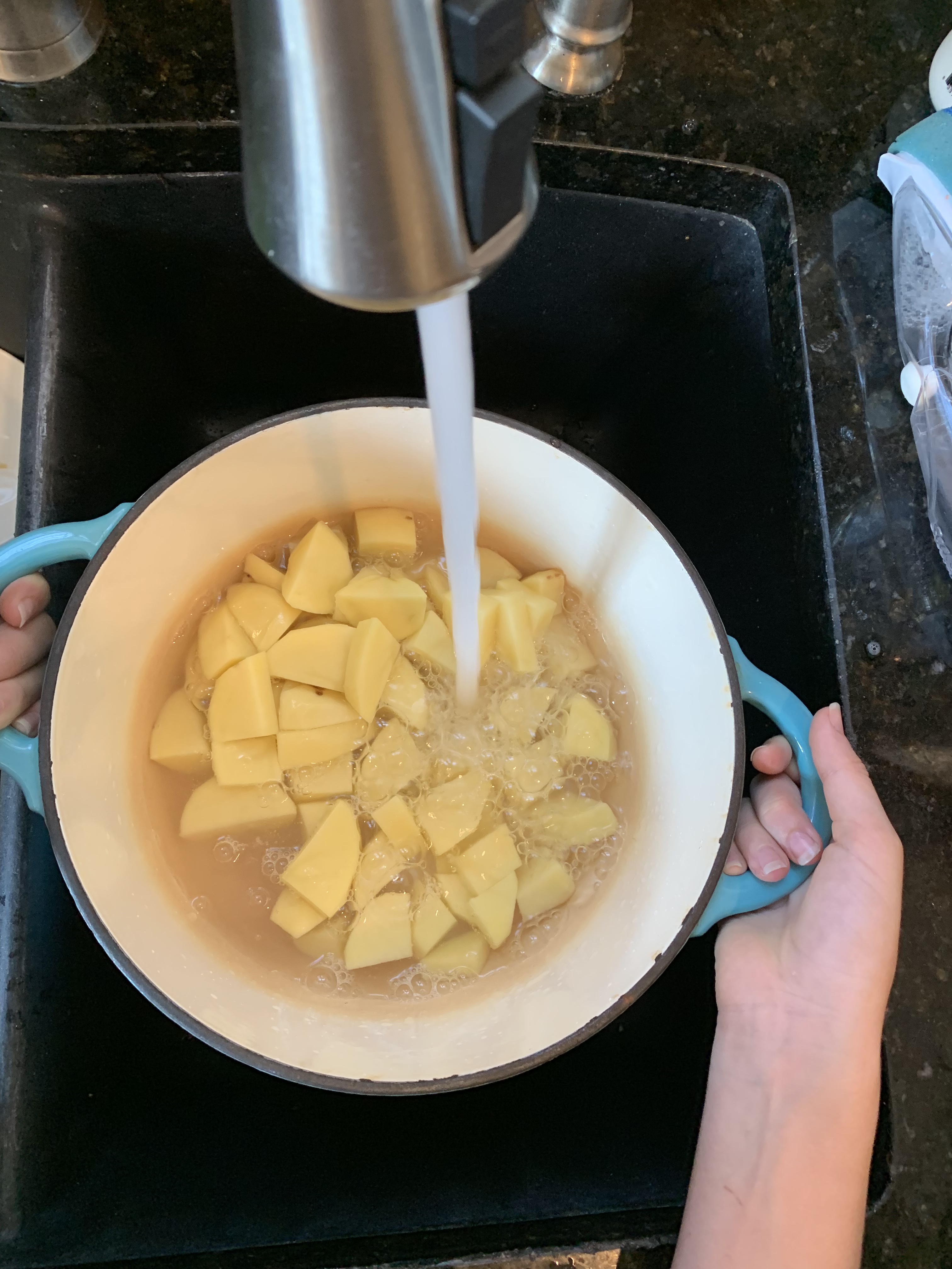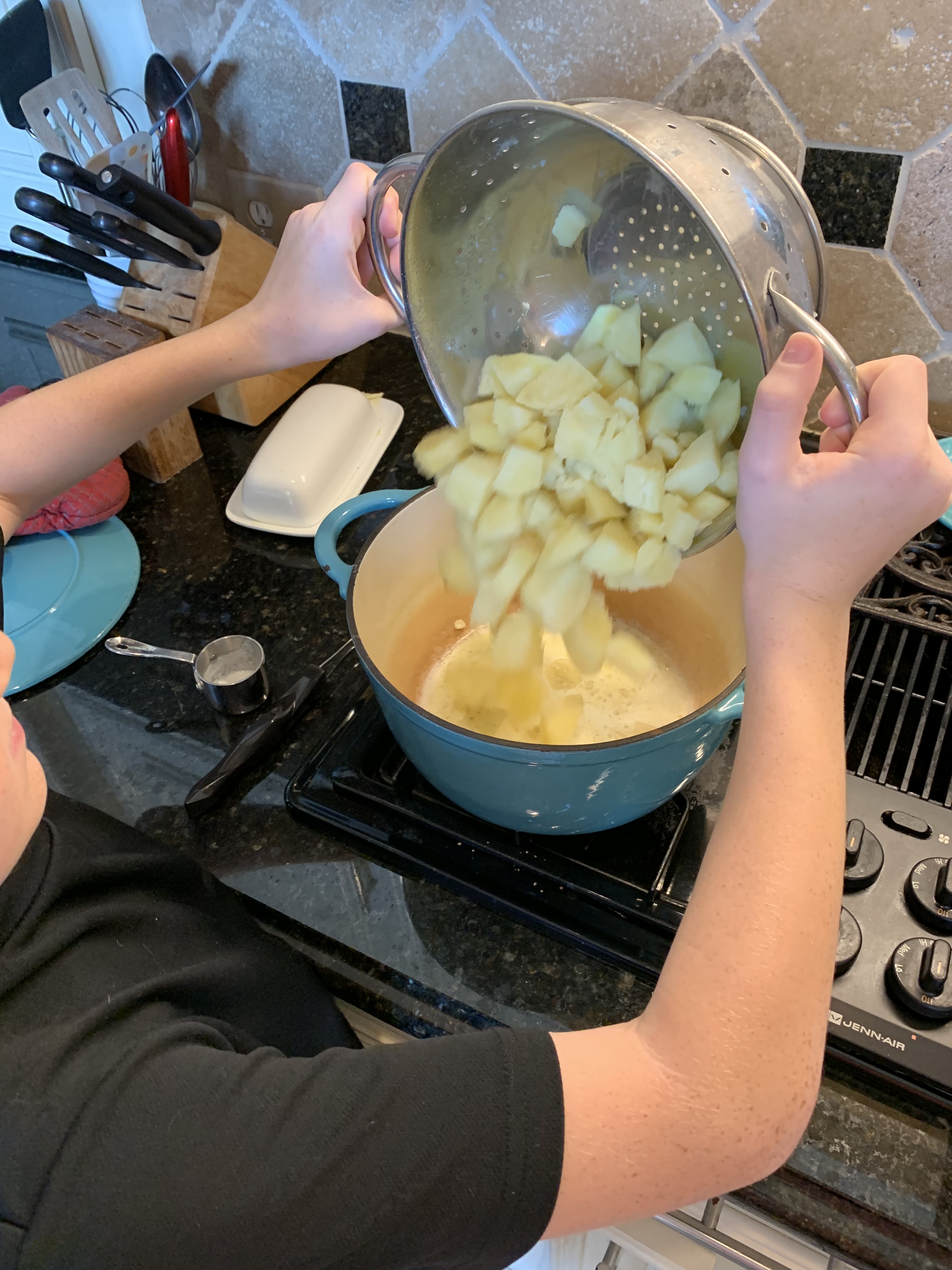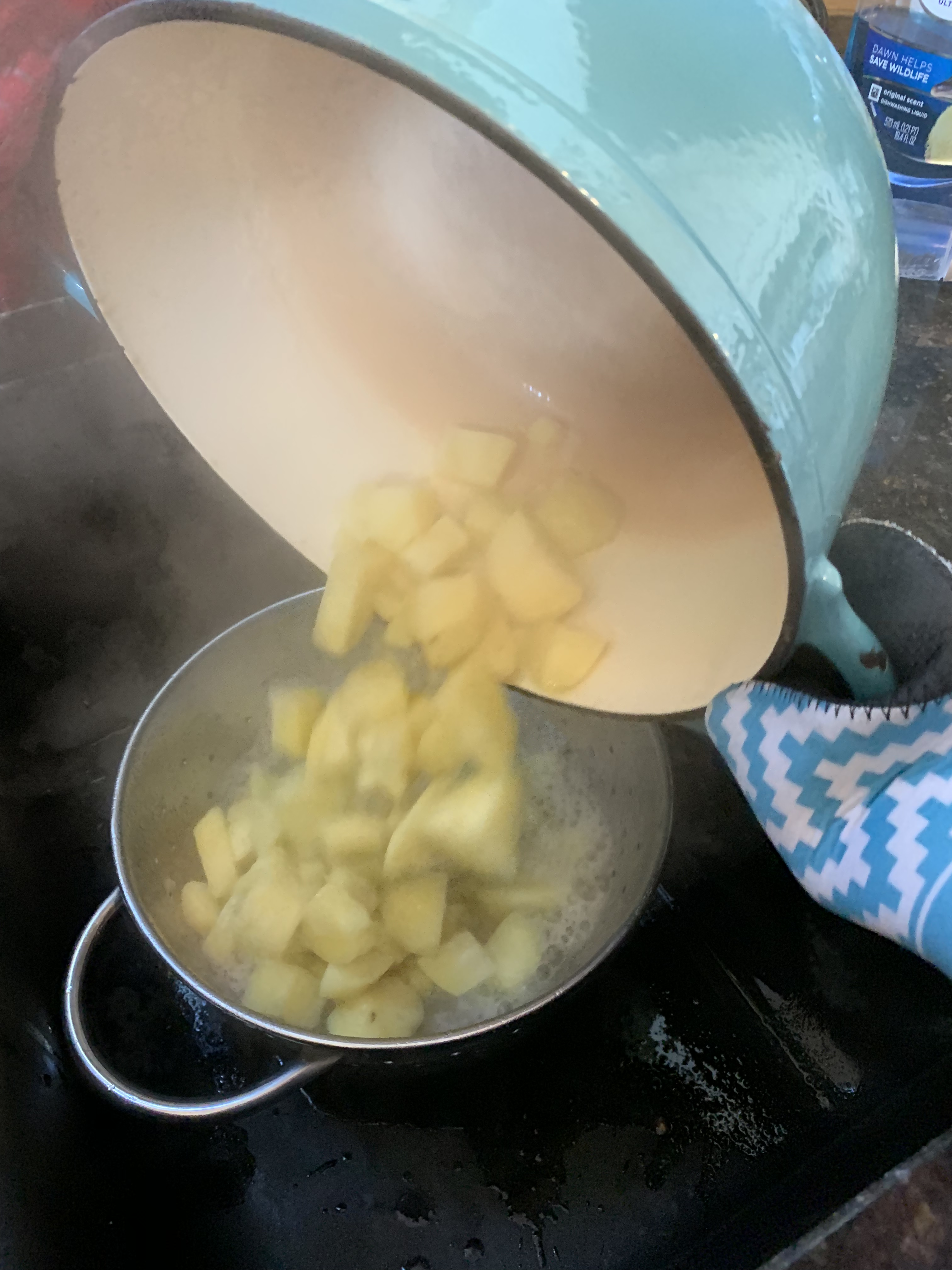 Those are my hands handling the heavy pot full of hot water and potatoes.