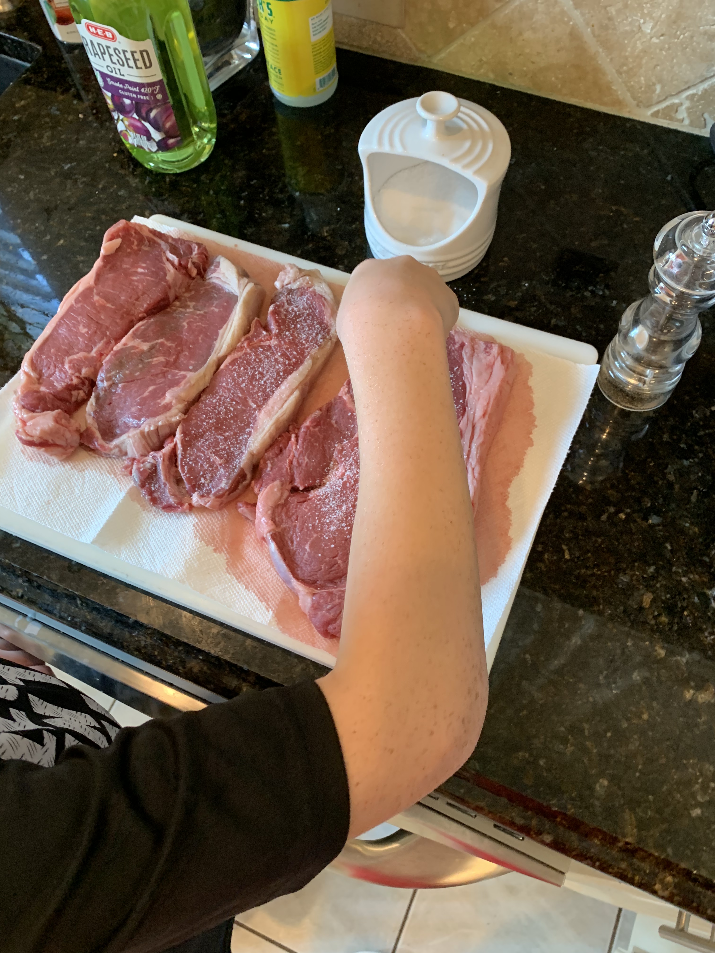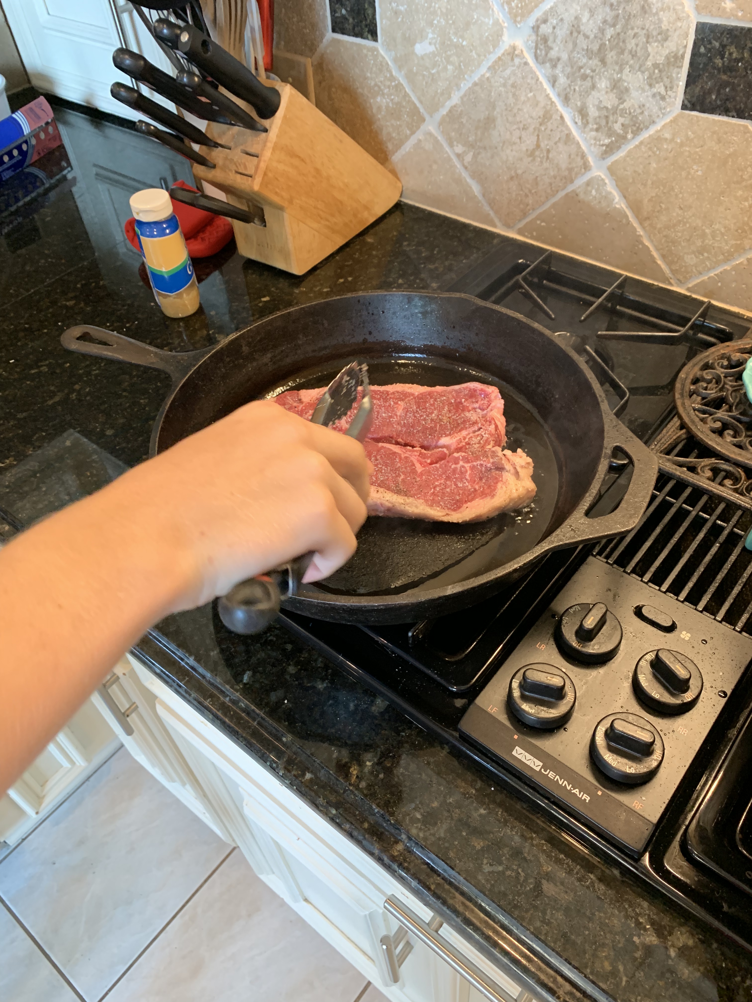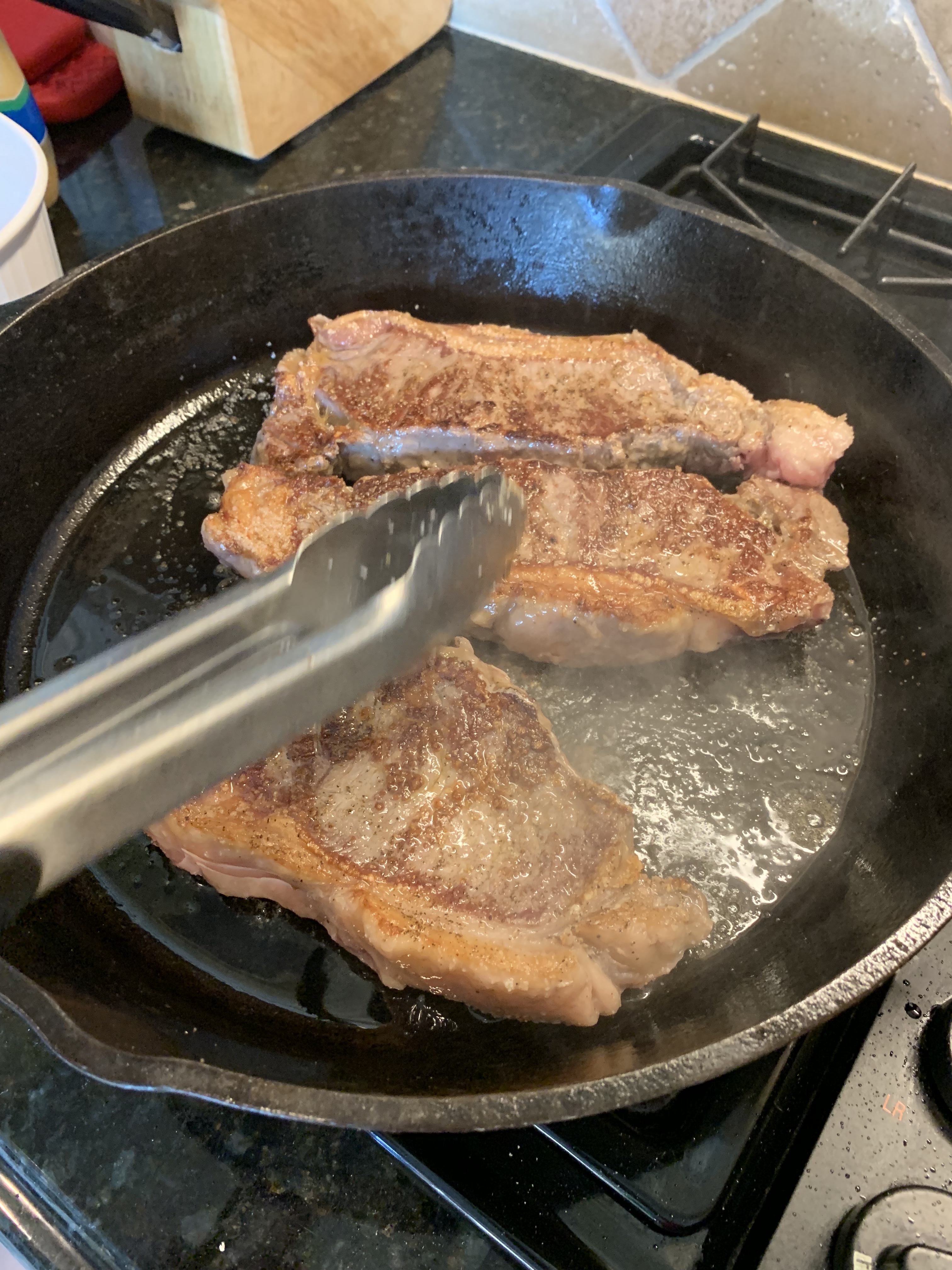5. As the pan is heating up, go ahead and season the steaks generously with salt and pepper. These are the only spices we use, so you want to make sure there is plenty of salt and pepper on them, but if you prefer something less salty, make sure you season to your taste. Luke went heavier on the salt and I preferred it over George’s steak, but Grandma is more sensitive to salt and preferred George’s steak instead. Again, it’s all a matter of taste. Don’t season the steaks until you are just about to put them in the pan because you want the steaks to be dry so that they sear with a lovely crust on the outside. If you add the salt ahead of time, the steak will release moisture and it won’t be dry when you place it in the pan.