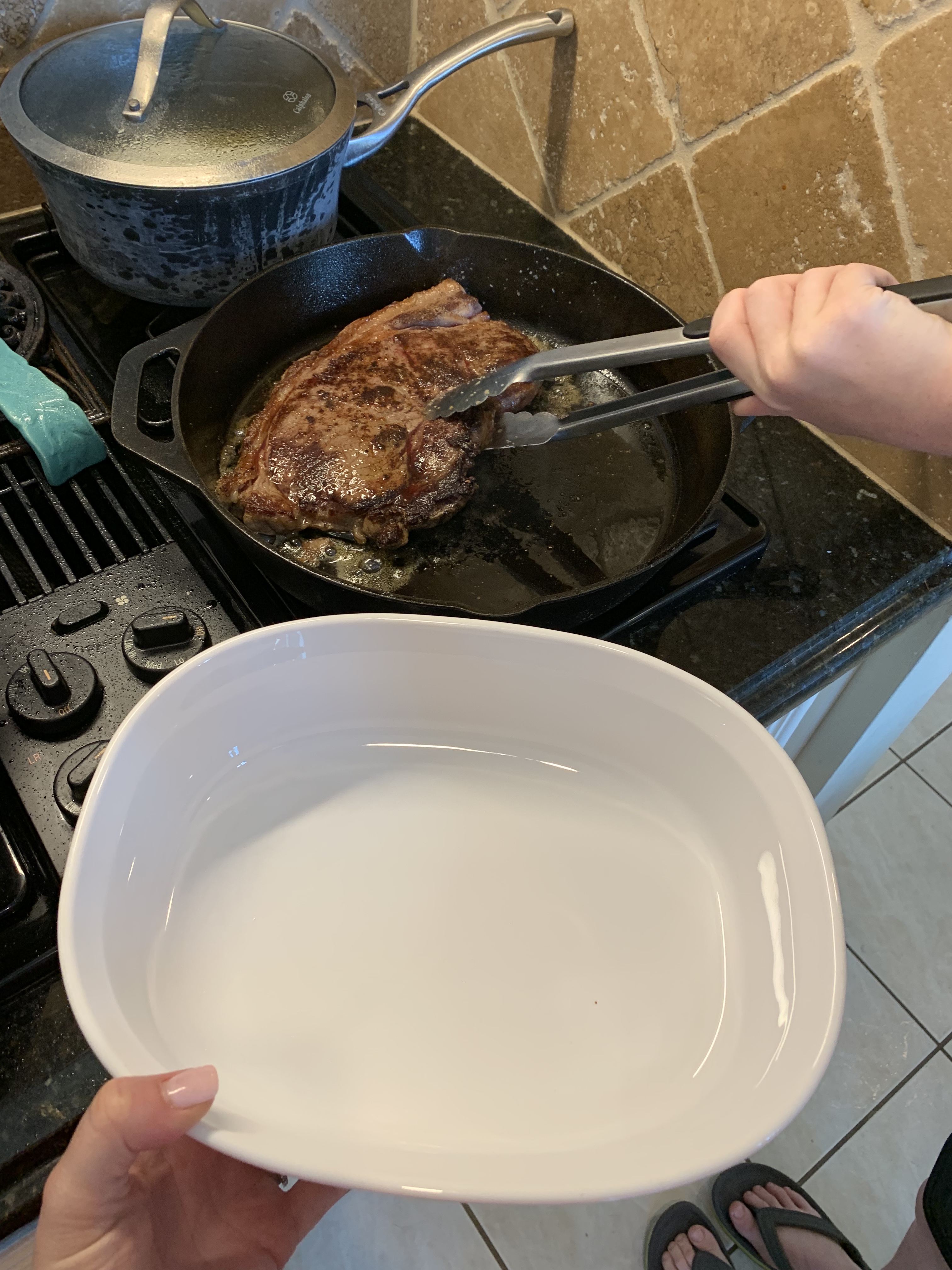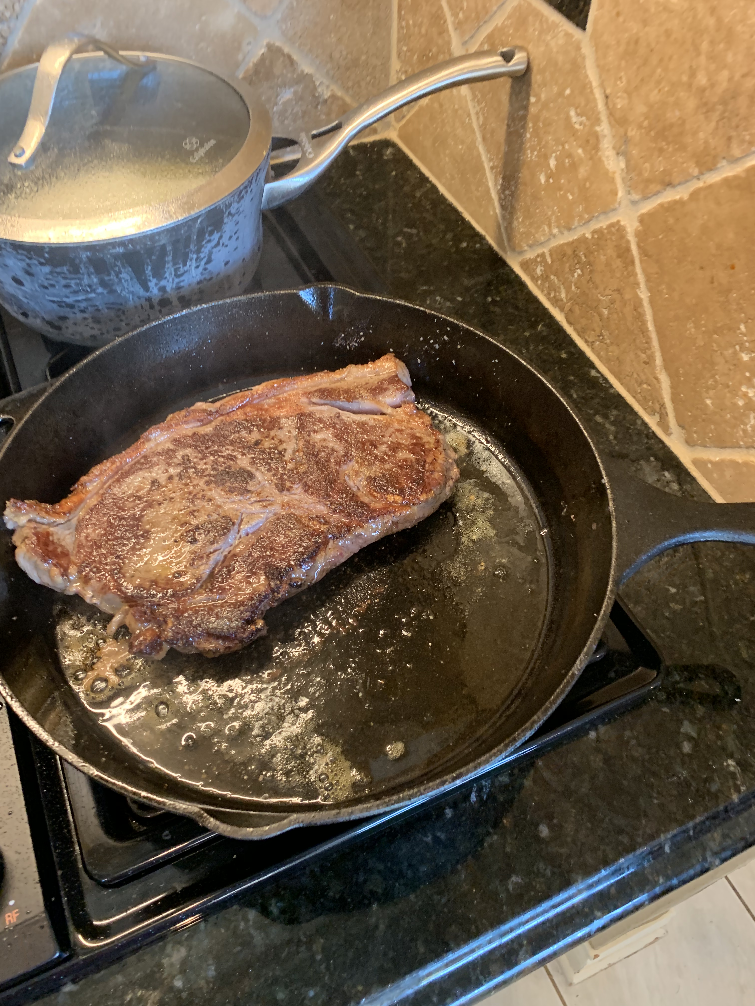 6. When the pan is fully heated (per instructions above), place steaks in pan and it should sizzle and splatter – this is the perfect temperature! Do not move the steaks once you have put them in the pan until it is time to turn them. Our steaks (and most steaks) are approximately 1-inch thick, and I recommend cooking the steaks for 3 minutes on each side depending on how high the “high” temperature on your stove is. We have a gas stove so it got pretty hot and 3 minutes on each side was almost too long to achieve medium rare. Flip the steaks after 3 minutes and cook another three minutes without moving the steak.