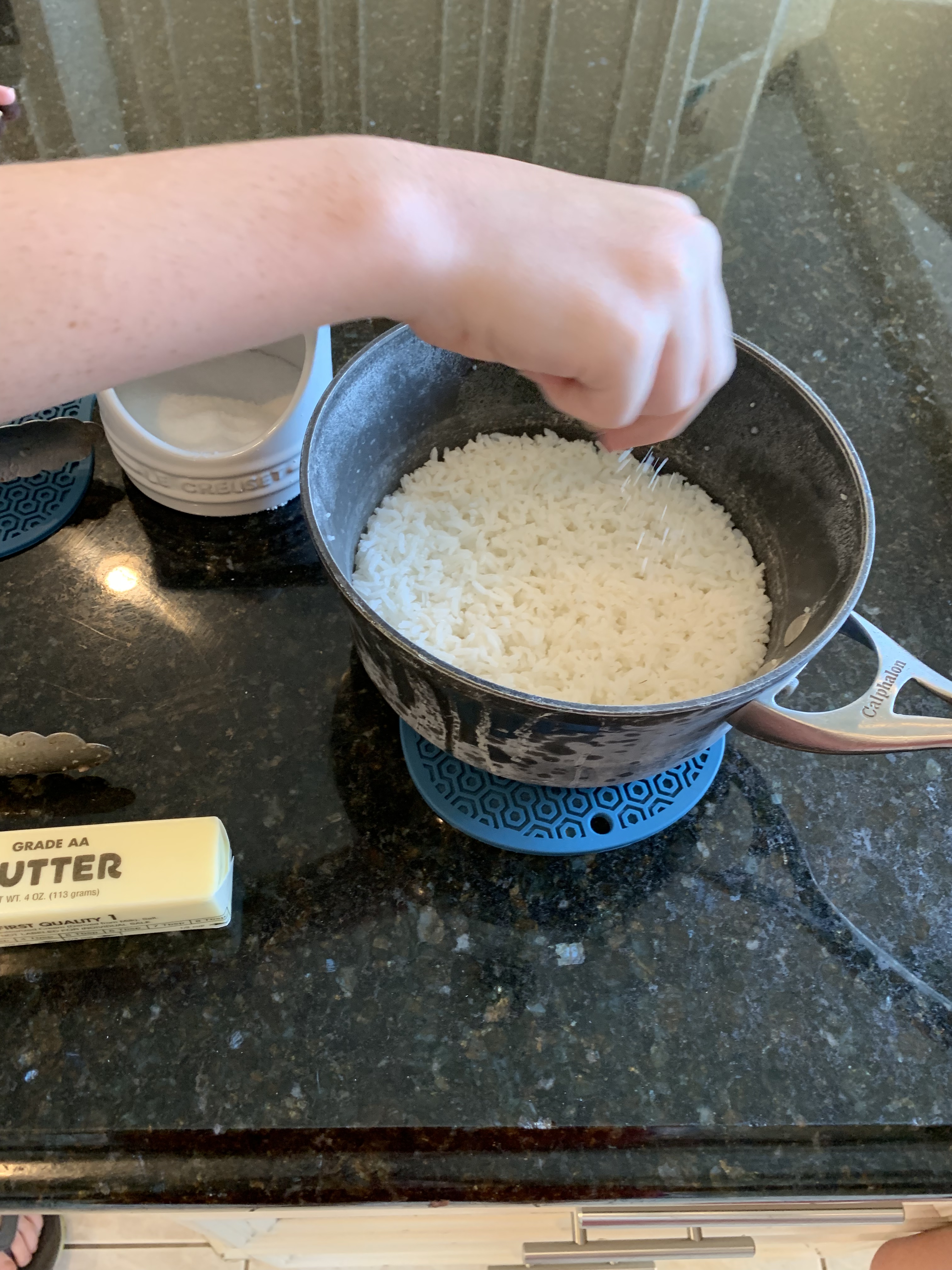 4. Remove the bay leaf, if using, and fluff rice before serving. If you adequately rinsed the rice, it should be light, fluffy, and non-clumpy. We are gluttons, so we add salt and two tablespoons of butter to make the rice extra delicious.