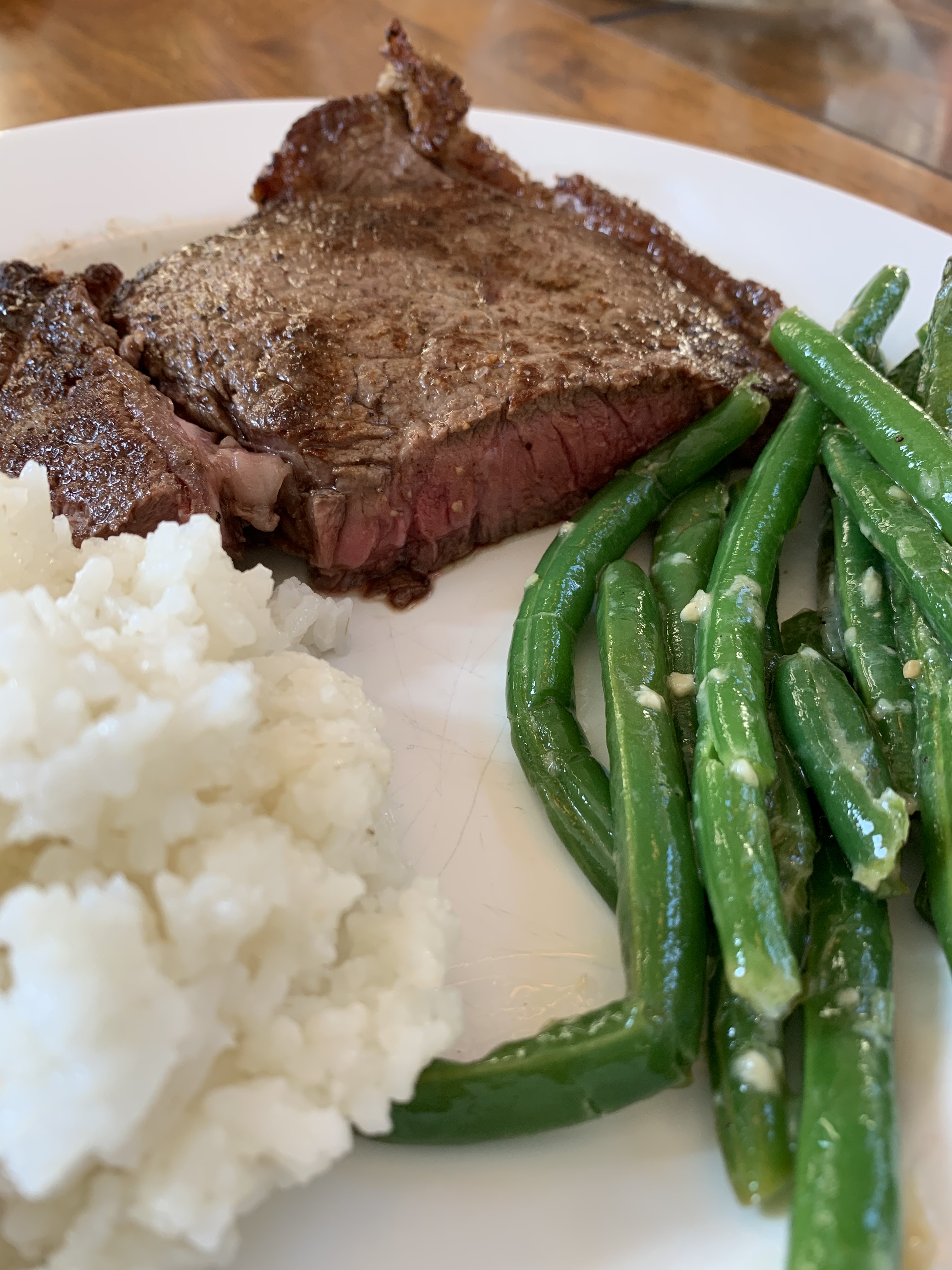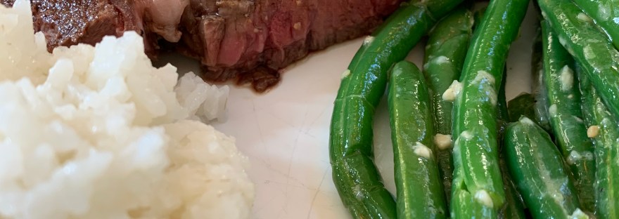 The finished product! Steaks, white rice, garlic green beans.
