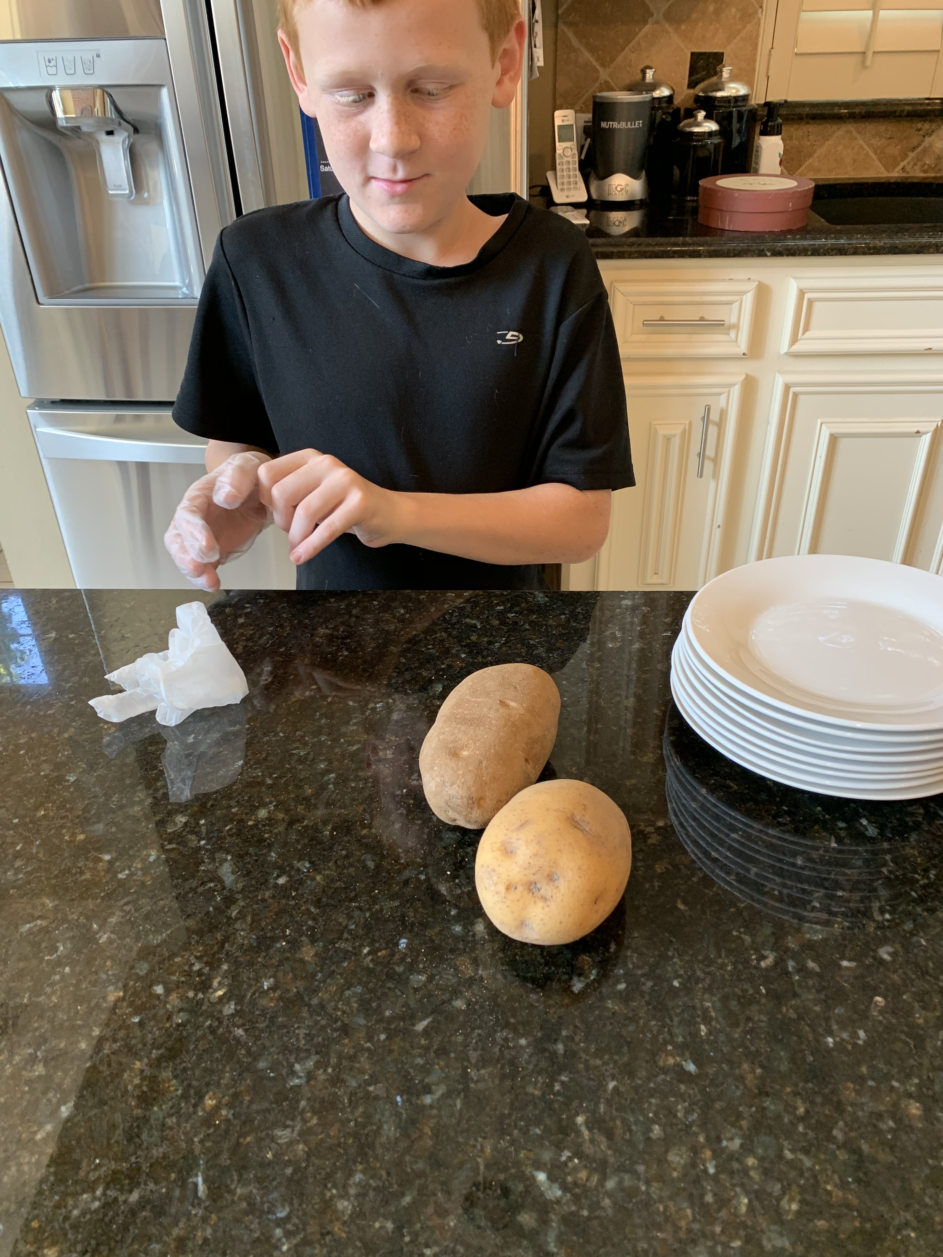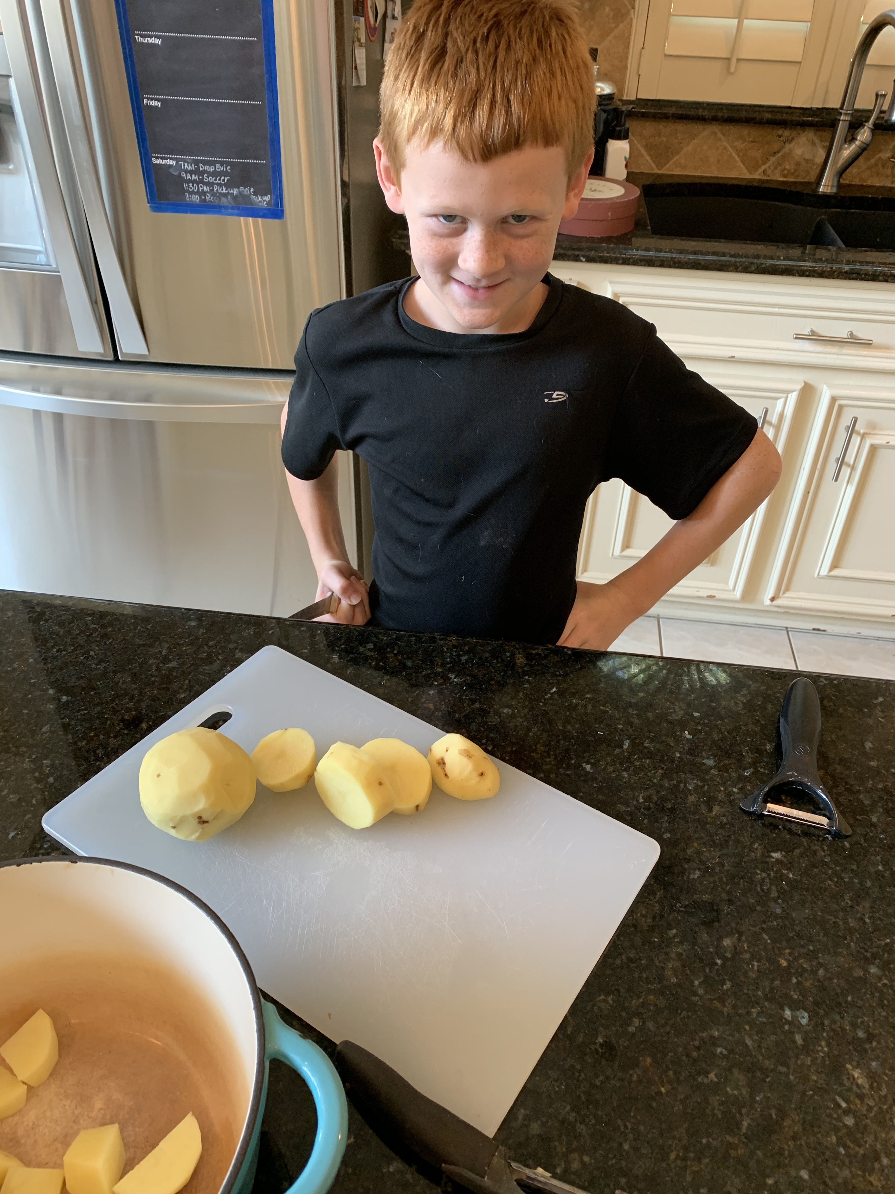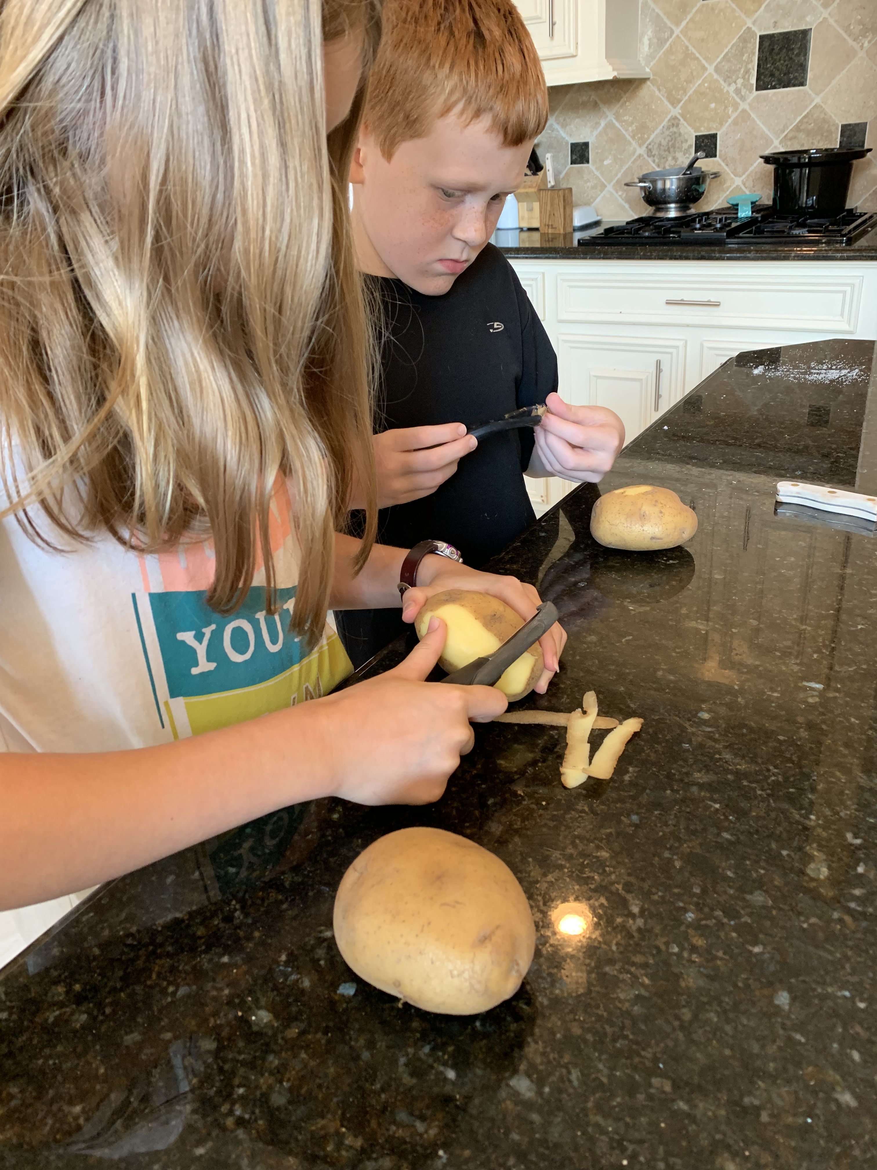 Begin by peeling your potatoes. This took much longer than expected in our house, but the job was done sufficiently, if not efficiently.