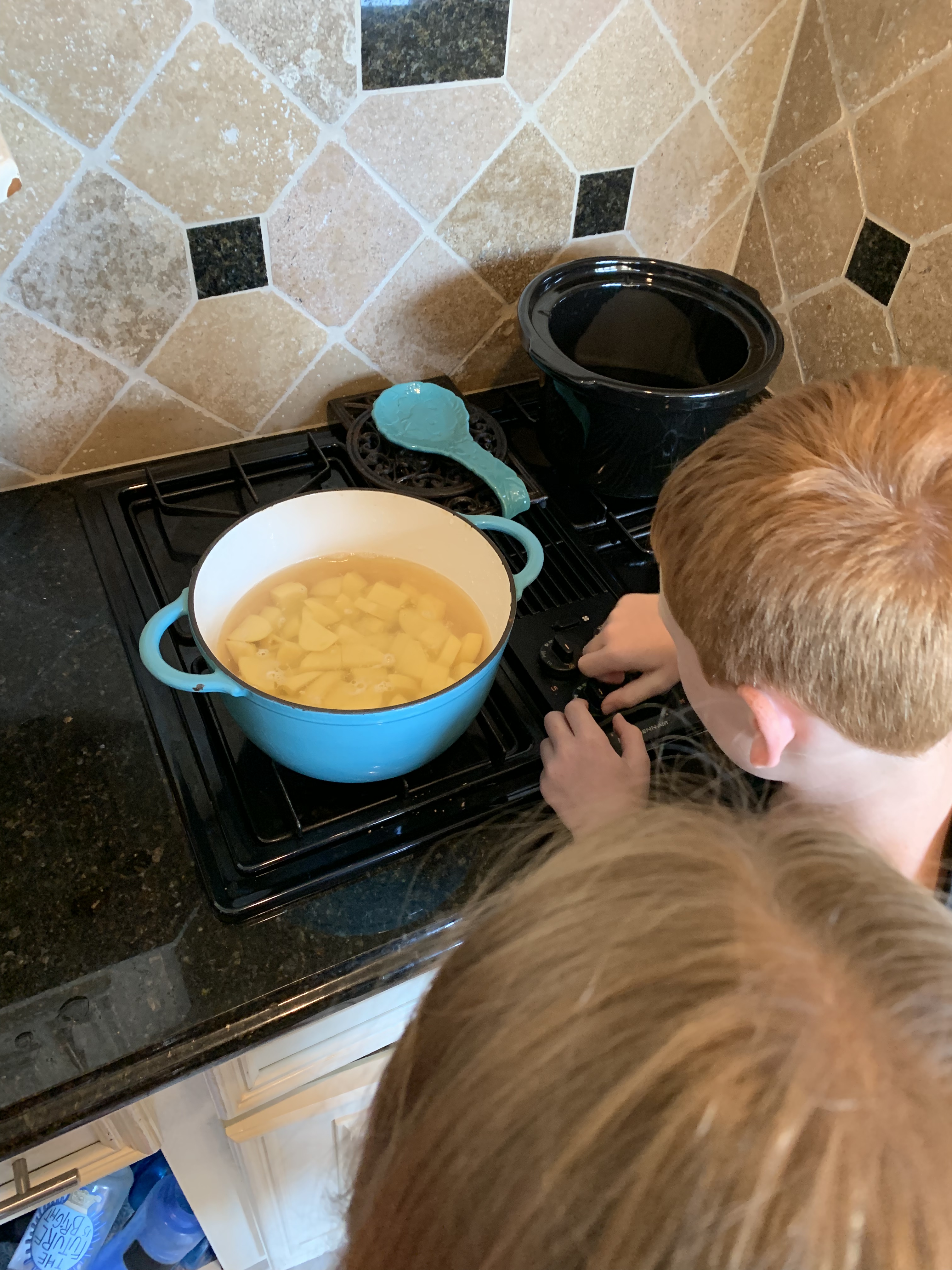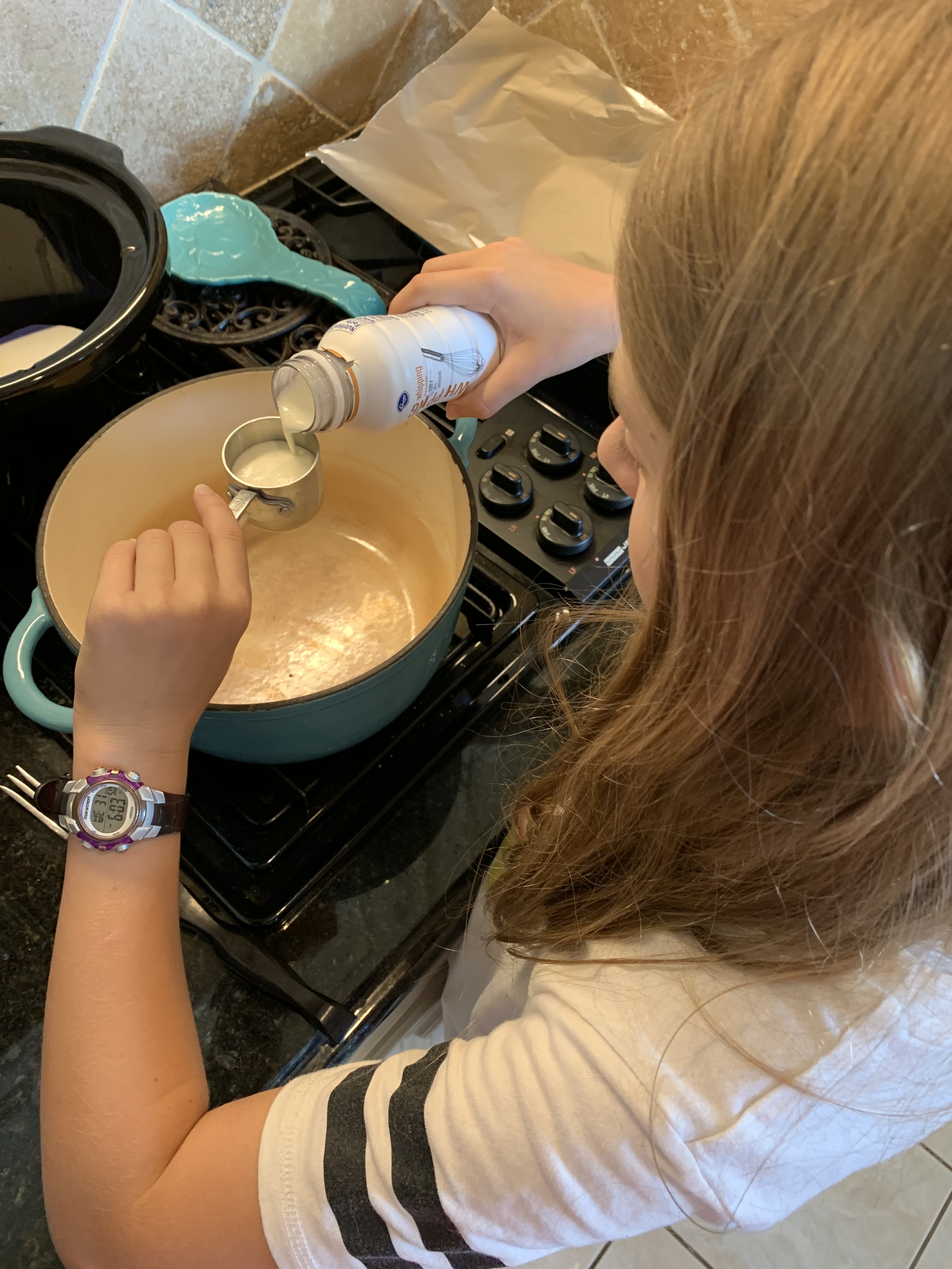 Evie held the heavy dutch oven as we added cold water. Miss Muscles!