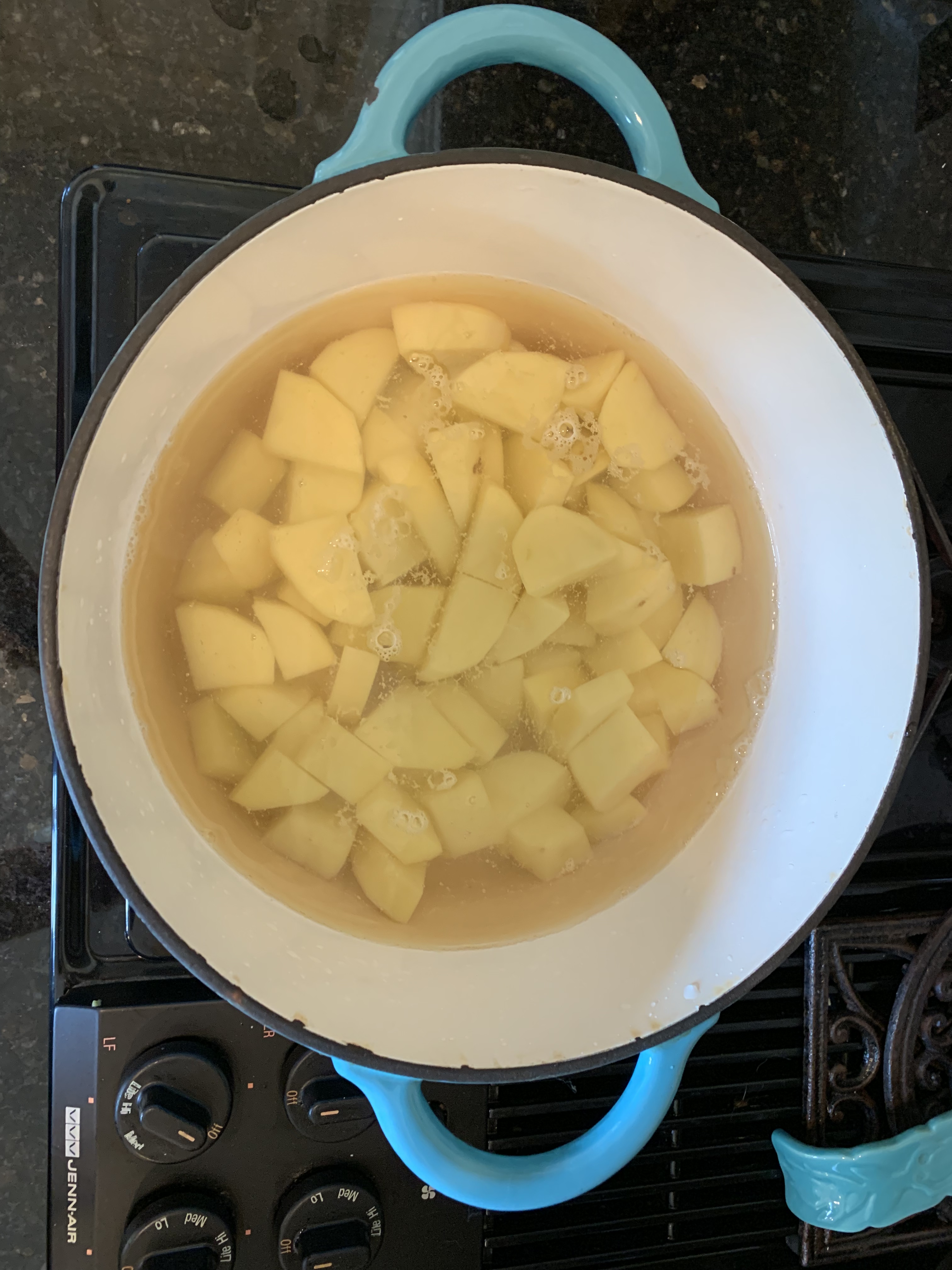 Place the pot of potatoes and cold water on the stove and bring to a boil over high heat.