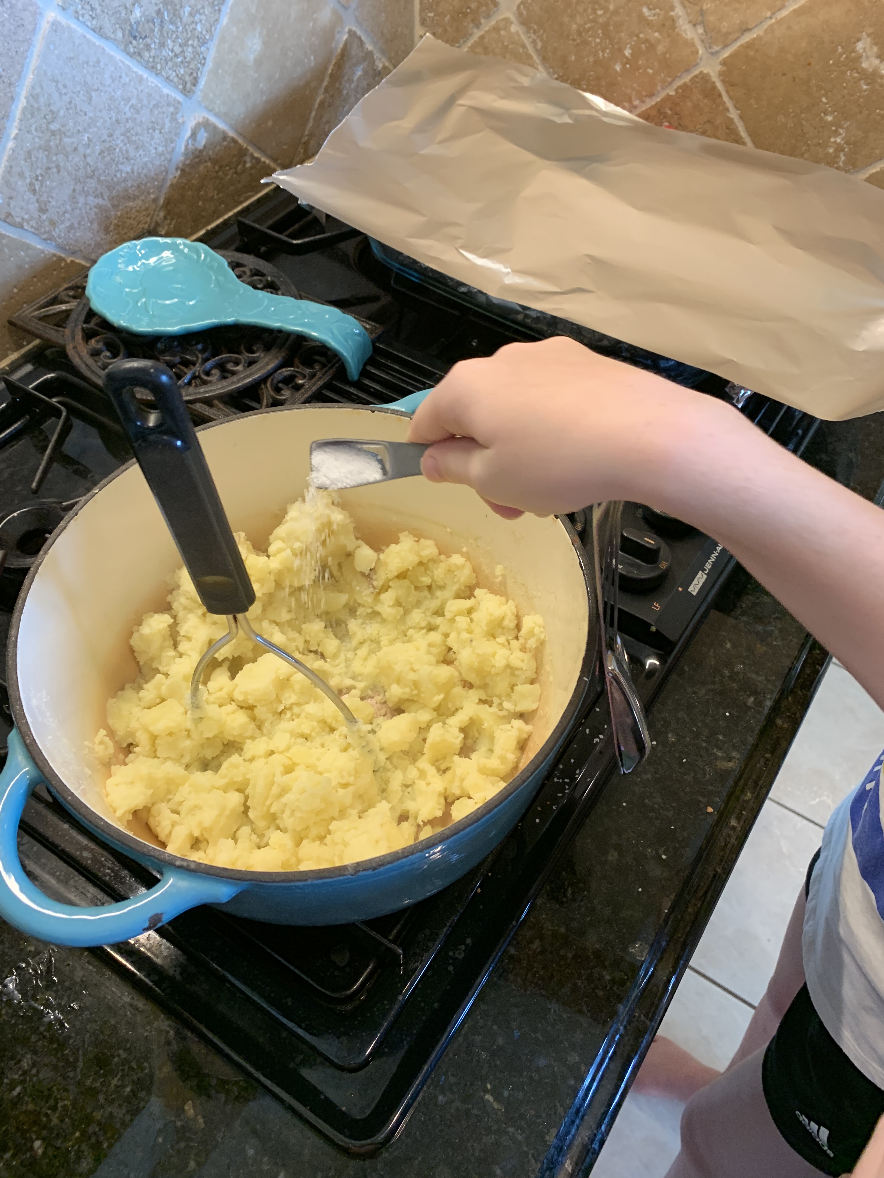6. Add salt and pepper (and any additional spices) to taste. *Note: I enjoy adding roasted garlic or garlic powder to my potatoes – but I’ll save that recipe for “Advanced Recipes for Growing Up”.