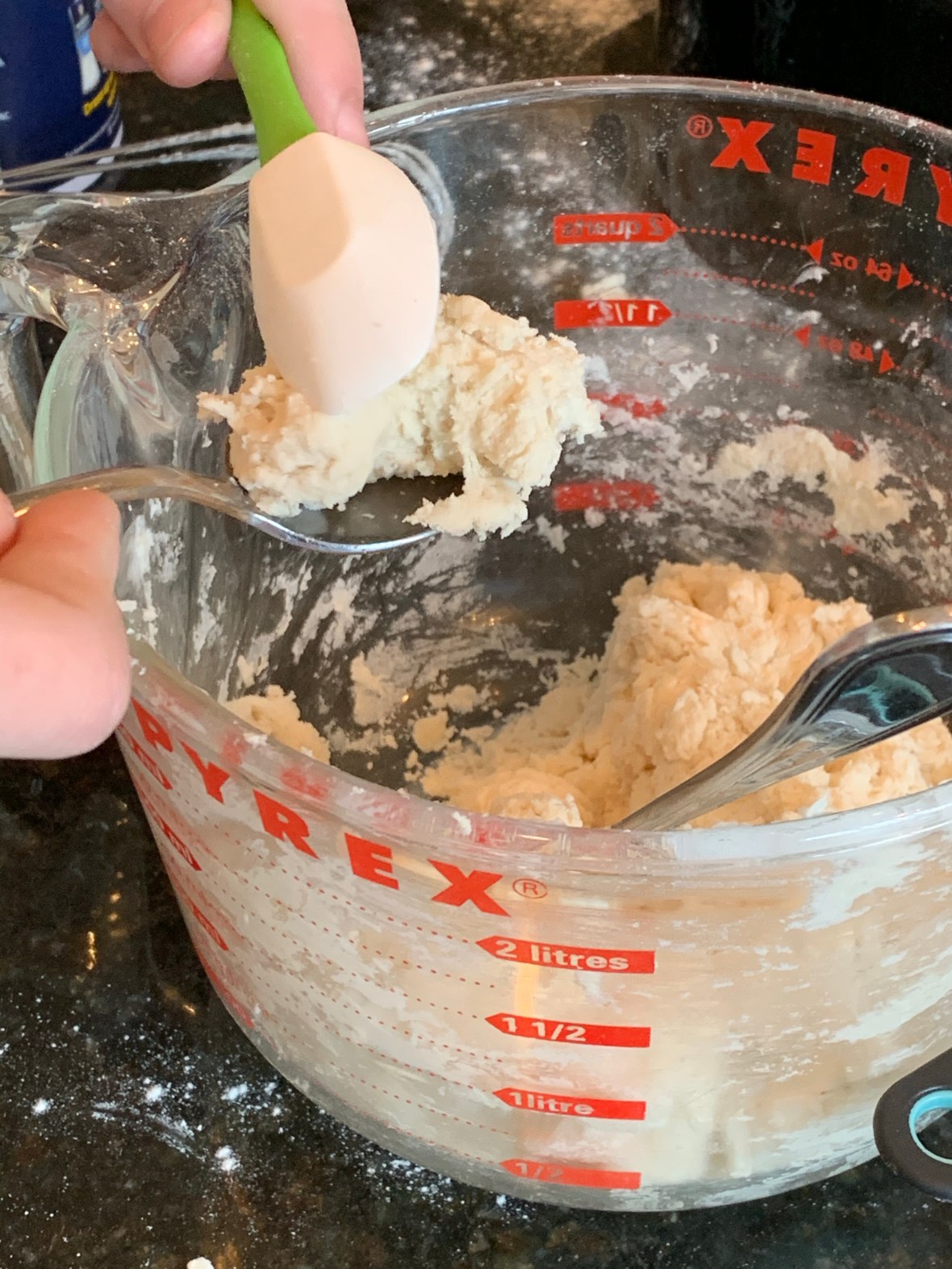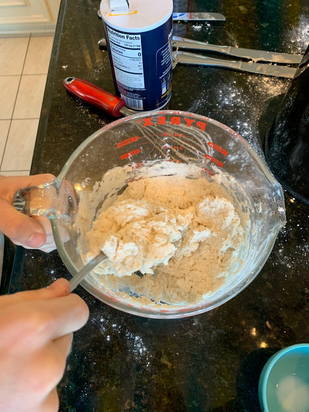 2. Add shortening and cut in with a pastry tool until it looks like coarse crumbs. We didn’t have one so we used a metal whisk and it worked great.
